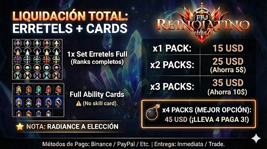- 1x Set Erretels Full (Ranks completos). - Full Ability Cards. - (No skill card). NOTA: RADIANCE A ELECCIÓN (¡Tú eliges el slot que necesitas!). |
