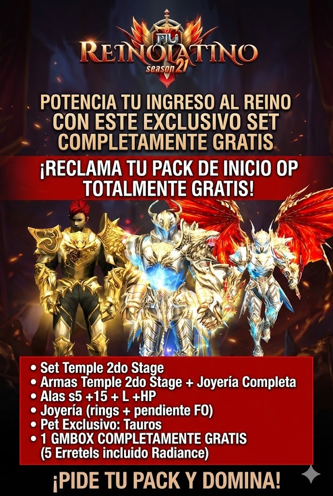 - Set Temple 2do Stage. - Armas Temple 2do Stage + Joyería Completa. - Joyeria (rings + pendiente FO). - Pet Exclusivo: Tauros. - Alas s5 +15 + L +HP. - 1 GMBOX COMPLETAMENTE GRATIS (5 Erretels incluido Radiance). IMPORTANTE: OFERTA VÁLIDA SOLO PARA CUENTAS NUEVAS y LÍMITE: 1 PACK POR PC / IP. |