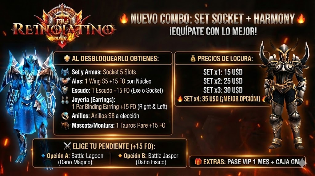 - Set y Armas: Socket de 5 Slots - Alas: Wing S5 +15 Full Option (FO) con Núcleo. - Escudo: +15 FO (Exe o Socket). - Joyería Premium: Par de Binding Earring +15 FO (Derecho e Izquierdo) + Anillos S8 a elección. - Montura Exclusiva: 1 Tauros Rare +15 FO. NOTA: ELIGE TU PENDIENTE (+15 FO): Opción A: Battle Lagoon (Daño Mágico) | Opción B: Battle Jasper (Daño Físico) |
